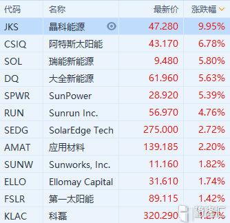 美股光伏概念全线上涨,阿特斯太阳能涨6.78%,瑞能新能源、大全新能源涨逾5%。晶科能源涨9.9%,消息称其运营子公司江西晶科申请在中国科创板上市。