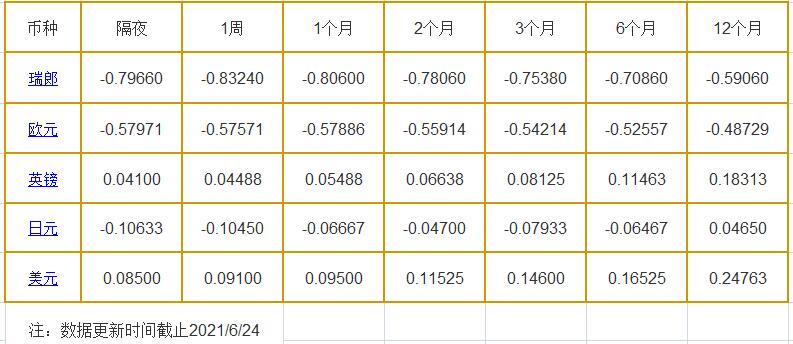 6月24日伦敦银行同业拆借利率: 隔夜LIOR:瑞郎报-0.7966%,欧元报-0.57971%,英镑报0.04100%,日元报-0.10633%,美元报0.08500%; 1周LIOR:瑞郎报-0.8324%,欧元报-0.57571%,英镑报0.04488%,日元报-0.10450%,美元报0.09100%; 1个月LIOR:瑞郎报-0.8060%,欧元报-0.57886%,英镑报0.05488%