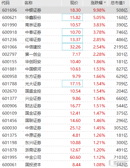 券商板块异动拉升,中银证券率先封板,华鑫股份涨超5%,南京证券、中泰证券涨超3%,红塔证券、中信建投、第一创业、华创阳安等快速走强。