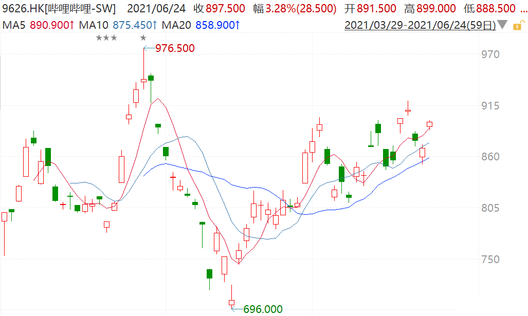 哔哩哔哩(9626.HK)跳空高开,盘中拉升一度涨3.45%报899港元,市值3450亿港元。隔夜美股哔哩哔哩(ILI.U)收涨3.84%报114.36美元,折算成港股市场价格为888.08港元/股。哔哩哔哩同时入选了格隆汇2021年“下注中国”十大核心资产和十大核心潜力资产名单。