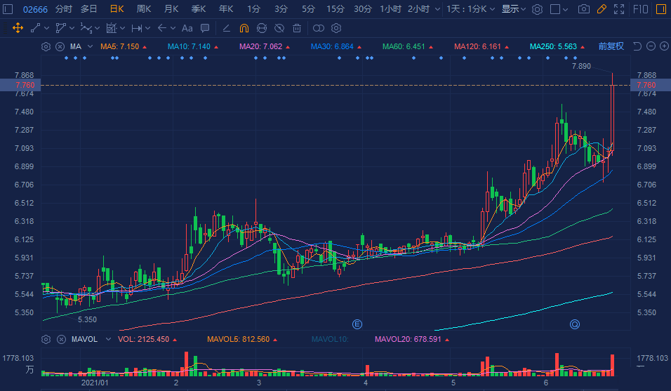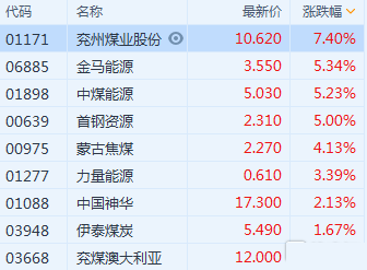 在港上市煤炭股普遍上涨,兖州煤业股份(1171.HK)涨7.4%,中煤能源(1898.HK)、首钢资源(0639.HK)涨5%,中国神华(1088.HK)涨2%。黑色系期货今日全线上涨,焦煤、焦炭涨逾5%,动力煤涨超2%。安信证券指,目前动力煤价格超预期,且板块估值处于历史底部,认为煤价中枢上涨有望推动上市公司业绩增长进而拉动板块估值回升。