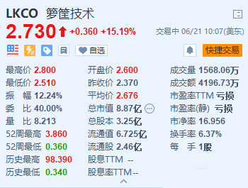 箩筐技术(LKCO.U)股价继续走强,现报2.73美元,涨幅15.19%,月内累计涨幅逾80%。 此前其全资子公司易图通获得“新一代交通控制网和智慧公路示范工程-江西昌九智慧高速基础支撑平台项目”服务合同。