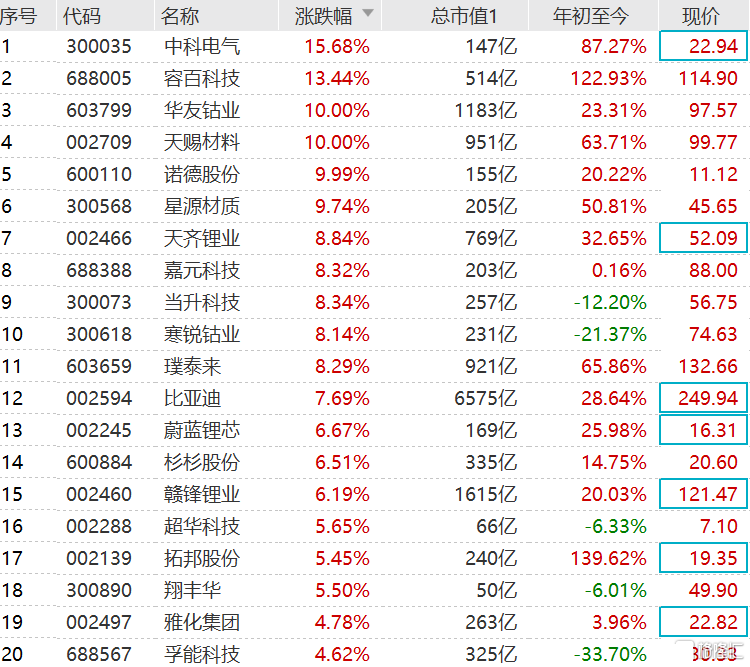 中科电气和容百科技涨超10%,天赐材料午后拉升封涨停板,诺德股份、华友钴业逼近涨停,星源材质涨超9%,璞泰来、嘉元科技、天齐锂业涨超8%,当升科技、比亚迪涨超7%,杉杉股份涨超5%,新宙邦等跟涨。消息面上,星源材质拟100亿元建设年产30亿平方米湿法隔膜和涂覆隔膜项目;天赐材料昨晚披露了一系列扩产项目,其中包