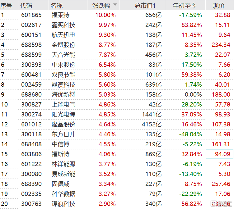 光伏股在经过周三的大幅回调会后,今日明显反弹,且为连续第二日反弹。成分股中,继露笑科技上午涨停后,福莱特午后拉升封涨停板,隆基股份、阳光电源和福斯特涨超4%,晶澳科技涨超5%,通威股份涨超2%。据资深行业人士称,今年以来光伏产业受上游原材料价格上涨影响较大,但近两日原材料价格已经开始回落,电池片出厂