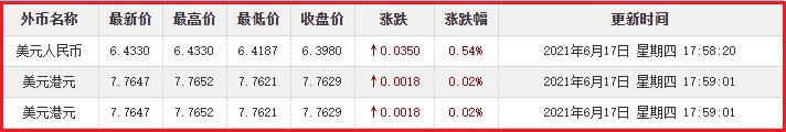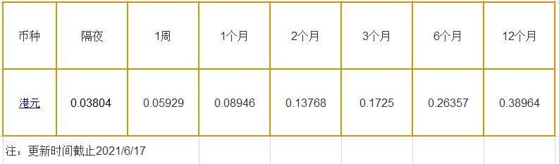 6月17日香港银行间同业拆借利率港币: 隔夜报0.03804%, 1周期报0.05929%, 1月期报0.08946%, 12月期报0.38964%。 香港银行同业拆放利率HIOR(HogkogItrakOffrdRat),指香港货币市场上,银行与银行之间的一年期以下的短期资金借贷利率,是从伦敦同业拆借利率(LIOR)
