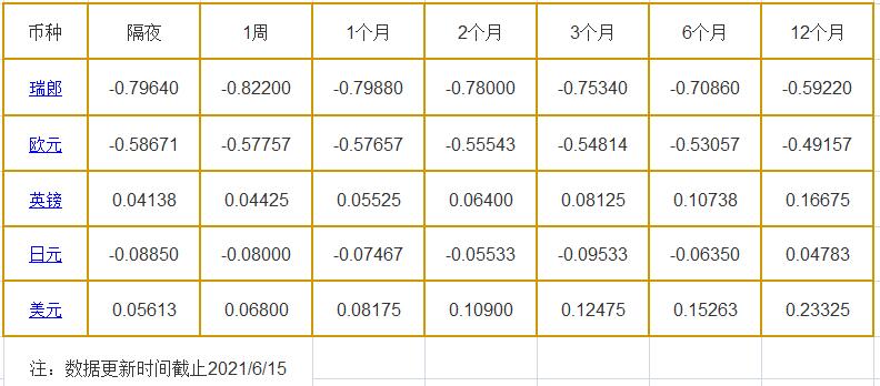 6月15日伦敦银行同业拆借利率: 隔夜LIOR:瑞郎报-0.79640%,欧元报-0.58671%,英镑报0.04138%,日元报-0.08850%,美元报0.05613%; 1周LIOR:瑞郎报-0.82200%,欧元报-0.57757%,英镑报0.04425%,日元报-0.08000%,美元报0.06800%; 1个月LIOR:瑞郎报-0.79880%,欧元报-0.57657%,英镑报0.055