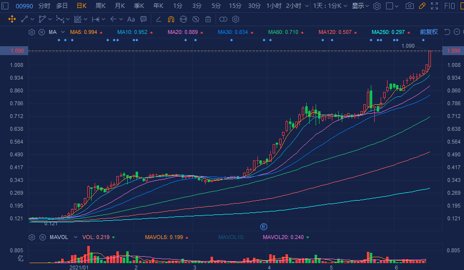 荣晖国际(0990.HK)延续强势上涨行情,续升8%走出9连涨,报1.09港元创1998年以来新高,总市值达140亿港元。 该股今年迄今累计暴涨690%,股价翻近8倍。荣晖国际日前拟2680万元收购山东鑫盛达67%股权,收购事项为公司在中国扩展商品相关业务的良机。在6月初,公司拟折让约13.8%配发8.15亿股,净筹约6.11亿