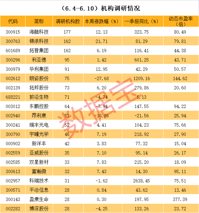 近一周机构调研的上市公司中,金融街、鞍钢股份、蓝帆医疗、*T中孚、城发环境、中原高速等个股一季报净利同比增长均超100%且动态市盈率低于10倍。净利增速方面,蓝帆医疗一季报净利同比增长超10倍居首。市盈率角度看,蓝帆医疗和中原高速两只个股市盈率均低于6倍。