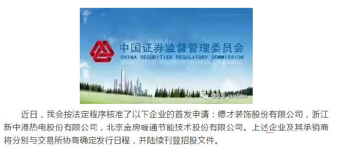 证监会核发3家企业IO批文,分别为德才装饰股份有限公司,浙江新中港热电股份有限公司,北京金房暖通节能技术股份有限公司。上述企业及其承销商将分别与交易所协商确定发行日程,并陆续刊登招股文件。含科创板、创业板在内,本周共13家企业获得IO批文。