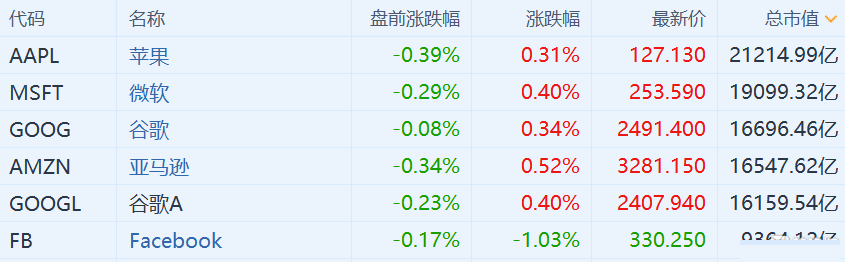 苹果跌0.39%,微软跌0.29%,谷歌跌0.08%,亚马逊跌0.34%,Facook跌0.17%。