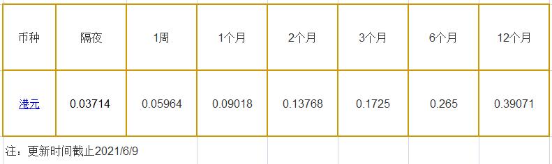 6月9日香港银行间同业拆借利率港币: 隔夜报0.03714%, 1周期报0.05964%, 1月期报0.09018%, 12月期报0.39071%。 香港银行同业拆放利率HIOR(HogkogItrakOffrdRat),指香港货币市场上,银行与银行之间的一年期以下的短期资金借贷利率,是从伦敦同业拆借利率(LIOR)变