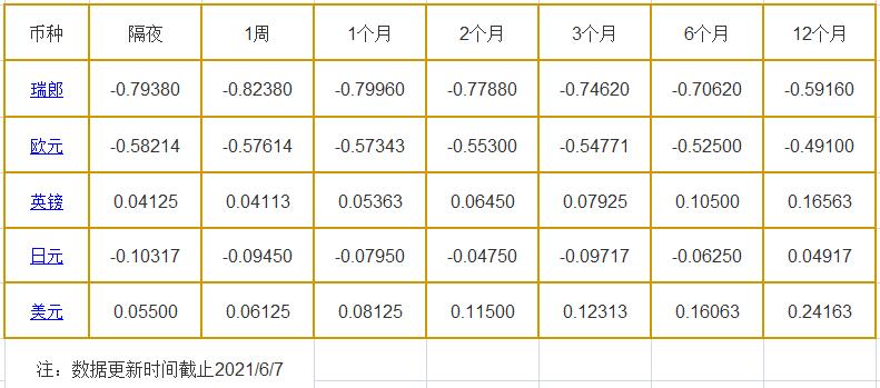 6月7日伦敦银行同业拆借利率: 隔夜LIOR:瑞郎报-0.79380%,欧元报-0.58214%,英镑报0.04125%,日元报-0.10317%,美元报0.05500%; 1周LIOR:瑞郎报-0.82380%,欧元报-0.57614%,英镑报0.04113%,日元报-0.09450%,美元报0.06125%; 1个月LIOR:瑞郎报-0.79960%,欧元报-0.57343%,英镑报0.0536