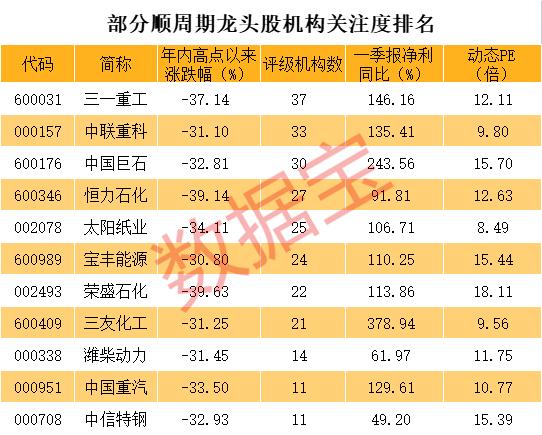 顺周期股在部分利空因素影响下,出现了较大调整。分析人士认为,随着市场风险偏好的提升,超跌的低估值顺周期股有望重新获得市场关注。 数据统计显示,最新市值200亿元以上、评级机构数10家以上且最新价较年内高点跌幅超过30%的顺周期股中,有11股一季报净利同比增长超过40%且动态市盈率在30倍以下。从超跌幅度