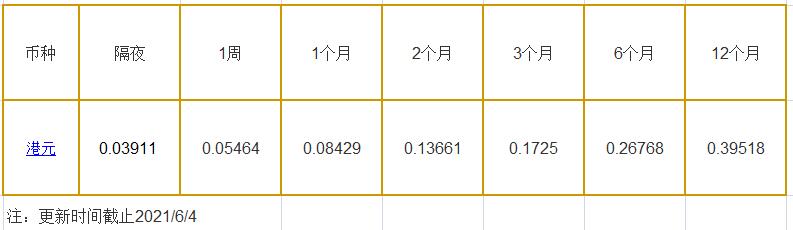 6月4日香港银行间同业拆借利率港币: 隔夜报0.03911%, 1周期报0.05464%, 1月期报0.08429%, 12月期报0.39518%。 香港银行同业拆放利率HIOR(HogkogItrakOffrdRat),指香港货币市场上,银行与银行之间的一年期以下的短期资金借贷利率,是从伦敦同业拆借利率(LIOR)变