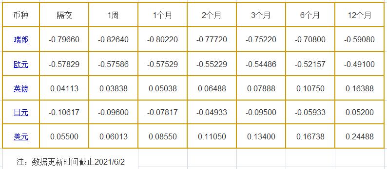 6月2日伦敦银行同业拆借利率: 隔夜LIOR:瑞郎报-0.79660%,欧元报-0.57829%,英镑报0.04113%,日元报-0.10617%,美元报0.05500%; 1周LIOR:瑞郎报-0.82640%,欧元报-0.57586%,英镑报0.03838%,日元报-0.09600%,美元报0.06013%; 1个月LIOR:瑞郎报-0.80220%,欧元报-0.57529%,英镑报0.0503