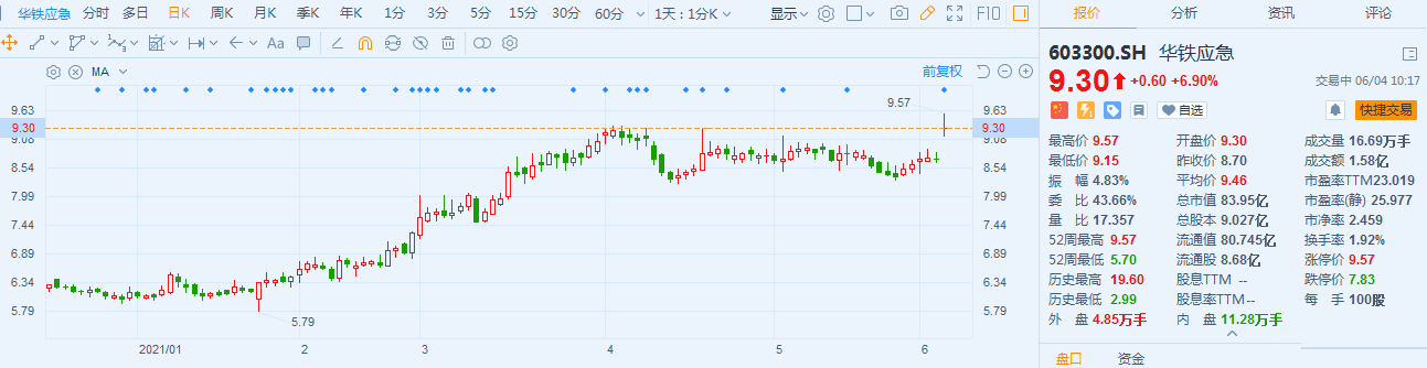 华铁应急(603300.H)股价触及涨停价后回落,现报9.3元,涨幅6.9%,最新总市值84亿。 国盛证券指,公司发布2021年股票期权激励计划(草案),拟激励包括董事、高级管理人员以及核心技术/业务人员共812人,合计授予股票期权4466万份,占公司总股本4.95%。本次激励行权价格10.50元/股,较当前股价溢价幅度