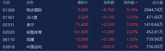 体育用品股全线拉升上扬,特步国际大涨超9%再度破顶,李宁、安踏齐创新高,361度等均有涨幅。日媒称,东京奥运会的组织者正在与日本政府筹备有观众参加的奥运会,前提是观众提供阴性检测结果或疫苗接种证明。招商证券(香港)相信,今年东京奥运会能够举行且中国国家队能参加,民族自豪感会进一步增强,而这将进一步助