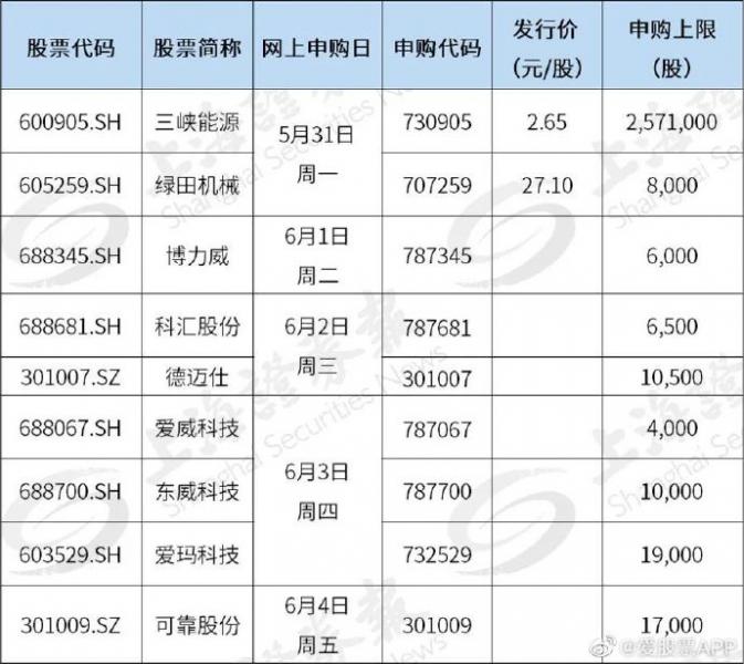 据目前安排,若无变化,未来一周(5月31日至6月4日)将有9只新股可申购,包括科创板新股4只,以及2只创业板新股、3只沪市主板新股。其中,计划周一申购的三峡能源,网上申购上限高达257.1万股,即顶格申购需2571万元沪市市值。自2010年7月上市的农业银行(网上申购上限1000万股)后,三峡能源的申购上限位列所有新股之首