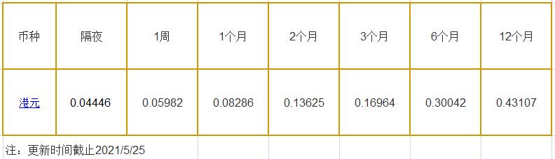 5月25日香港银行间同业拆借利率港币: 隔夜报0.04446%, 1周期报0.05982%, 1月期报0.08286%, 12月期报0.43107%。 香港银行同业拆放利率HIOR(HogkogItrakOffrdRat),指香港货币市场上,银行与银行之间的一年期以下的短期资金借贷利率,是从伦敦同业拆借利率(LIOR)