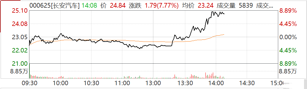 长安汽车(000625.Z)直线拉升一度涨近9%报25.1元,市值1186亿元。有消息称,华为正扩大与长安汽车的智能汽车合作伙伴关系,包括汽车用半导体的设计和开发,他们可能很快会成立一家芯片开发合资企业。不过长安汽车目前回应称,和华为主要合作的是全新平台的开发,以及品牌的合作。 另外,长安汽车称控股子公司阿