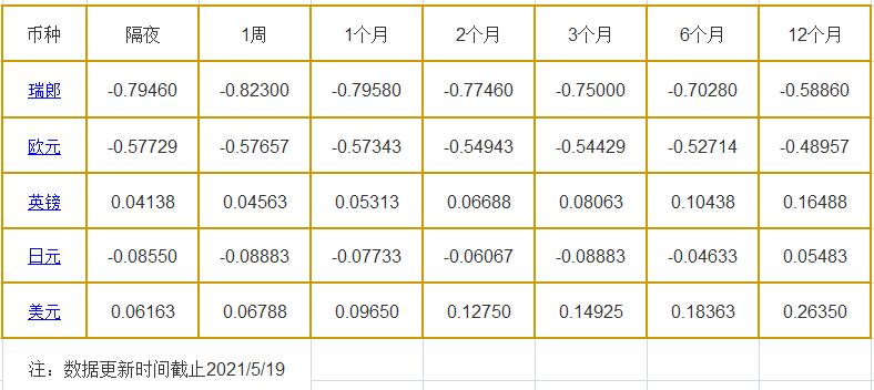 5月19日伦敦银行同业拆借利率: 隔夜LIOR:瑞郎报-0.79460%,欧元报-0.57729%,英镑报0.04138%,日元报-0.08550%,美元报0.06163%; 1周LIOR:瑞郎报-0.82300%,欧元报-0.57657%,英镑报0.04563%,日元报-0.08883%,美元报0.06788%; 1个月LIOR:瑞郎报-0.79580%,欧元报-0.57343%,英镑报0.053