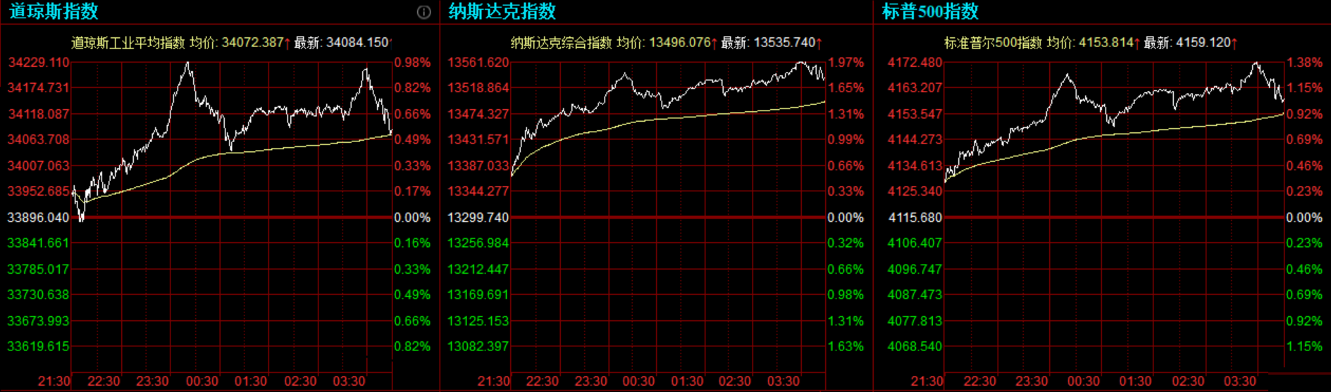 美股结束此前连续三天的跌势,随着科技股强劲反弹,三大股指全线收涨。美国劳工部报告称,上周初请失业救济降至44.4万,创疫情以来新低,提振了市场情绪。投资者继续关注通胀及其对美联储政策的影响。 道指收涨188.11点,或0.55%,报34084.15点;纳指涨236.00点,或1.77%,报13535.74点;标普500指数涨43.44点