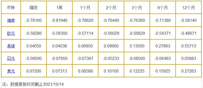10月14日伦敦银行同业拆借利率: 隔夜LIOR:瑞郎报-0.78160%,欧元报-0.58286%,英镑报0.04050%,日元报-0.09500%,美元报0.07200%; 1周LIOR:瑞郎报-0.81940%,欧元报-0.58300%,英镑报0.04038%,日元报-0.07950%,美元报0.07313%; 1个月LIOR:瑞郎报-0.78620%,欧元报-0.57114%,英镑报0.06