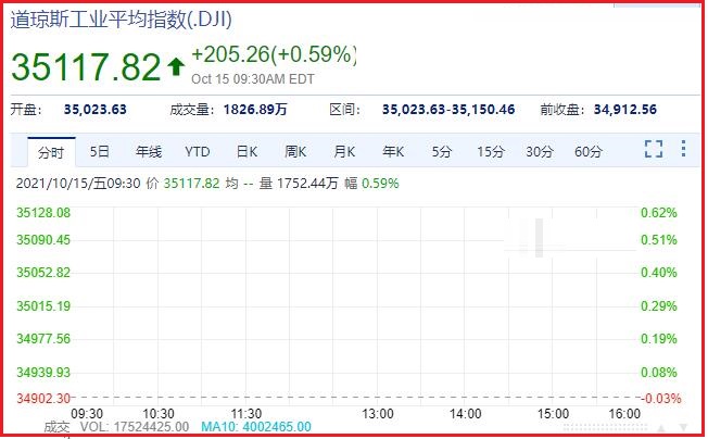 美股三大指数集体高开,道指涨0.64%,纳指涨0.46%,标普500指数涨0.51%。中概券商股延续跌势,富途控股跌超1%,老虎证券跌超2%。维珍银河跌超15%,此前公司宣布将商用太空旅行服务推迟至明年第四季度。 1、截止发稿时间,道琼斯报于:35120.25,成交量:2009.15万 2、美股快报:周五公布的数据