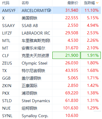 美国钢铁涨超5%,克里夫斯天然资源、安赛乐米塔尔涨约2%。