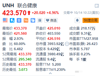 联合健康(UH.U)冲高回落,盘中最高见433.37美元再创历史新高,现回落至423.57美元,涨幅4.96%。 公司Q3净营收723.37亿美元,去年同期为651.15亿美元,同比增长11%;净利润41.91亿美元,去年同期为32.56亿美元,同比增长28.7%。
