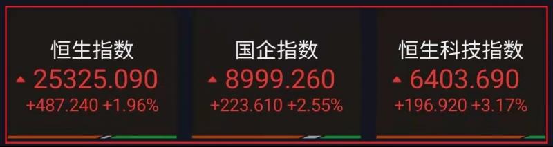 昨日回顾: 1.恒生指数昨早市先高开324点至25161点,其后在买盘主导下再进一步上升,港股在25350点上下震荡,截至收盘,港股恒指1.96%,报125325.09点;国企指数涨2.55%,红筹指数跌0.13%; 2.恒生科技指数(6402.96196.193.16%)涨3.17%,阿里涨7.91%,百度涨6.41%,京东涨5.20%,腾讯涨2.95%;