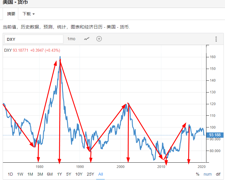 一、美元和黄金呈现明显的跷跷板效应 1、美元的几个重要转折点时间分别为 低点:1978年,1992年,2008年 高点:1970年,1985得,2002年,2017年 2、黄金相对的高低点为 低点:1970年,1984年,2001年,2015年 高点:1980年,2011年,下一个高点还在过程中 3、总结:从历史数据可以看到,黄金的高点