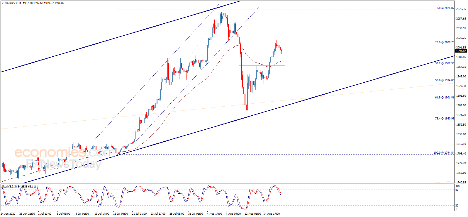 周三(8月19日)亚市盘中,现货黄金保持跌势,金价现报1994美元/盎司附近。cooi.co周三最新撰文,对日内黄金走势进行分析。 cooi.co在文章中写道,金价在2008.80美元/盎司面临坚固阻力后出现下滑,金价可能测试1967.90美元/盎司支撑。不过,随机指标正摆脱其负面动能,目前等待金价展开反弹并恢复主要看涨趋