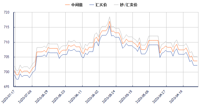 美元兑换人民币汇率(2020年7月17日) 类别 汇买价 钞/汇卖价 中间价 更新时间 美元兑换人民币汇率 698.73 701.7