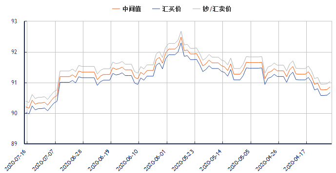 港币兑换人民币汇率(2020年7月16日) 类别 汇买价 钞/汇卖价 中间价 更新时间 港币兑换人民币汇率 90.03 90.39