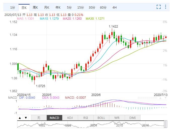周一(7月13日)亚市盘中,欧元兑美元继续维持上周五以来的强势,持于1.13关口上方,周末市场风险情绪继续回暖,避险美元再遭抛售,亚市盘中美元指数震荡下行触及日内低点96.47,跌幅0.16%。而美元走低,提振欧系货币走高,欧元兑美元刷新日内高位至1.1324,日内涨幅0.20%,欧元兑日元刚刚触及121.00关口,最新
