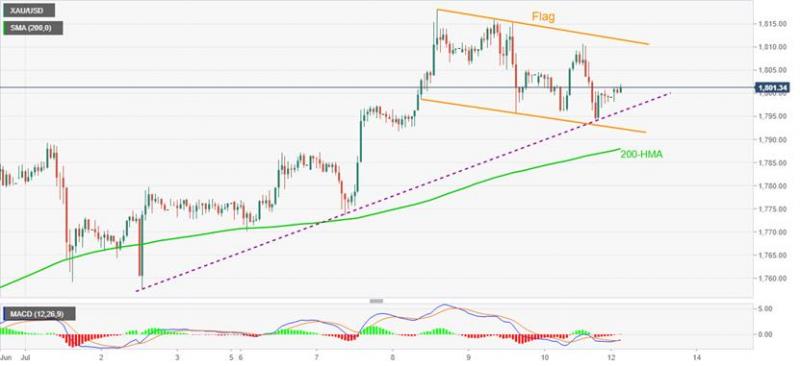 周一(7月13日)亚市盘中,现货黄金温和上涨,目前交投在1800美元附近。 针对黄金的短期走势,分析师Ailachal撰文进行简要分析,内容如下: 小时图上,黄金形成了一个看涨旗形,不过目前在长达7日的支撑趋势线以及200小时均线上方保持动能。 考虑到金价在近期关键支撑位反复反弹,加上ACD走势,
