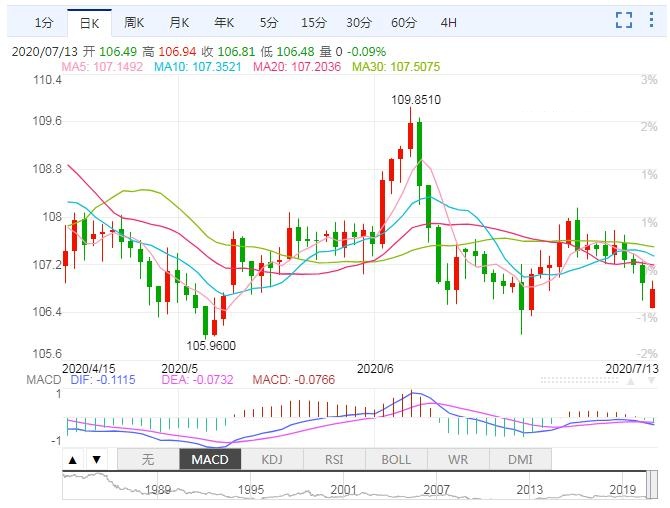 美元兑日元也触及两周低点,尾盘跌0.25%,报106.93;早些时候达到6月24日以来的最低水平,一位交易员称,在美东时间上午11点定盘前后,出现了一些空头回补,帮助汇率缩减了跌幅,他补充说,到106日元之间存在着小型但常见的买盘。尽管风险情绪起伏不定,但日元一直在狭窄的区间交易,一个月隐含波动率接近纪录