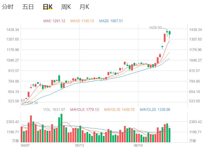 最高1,417.26最低1,311.34成交量1,631万成交额225亿 今开1,405.00昨收1,389.86日振幅7.62%换手率11.05% 总市值2,532亿流通市值2,017亿总股本1.85亿流通股本1.48亿 特斯拉的股价已经上涨了一段时间,尽管它似乎一次徘徊在1000美元以下。投资者一想到它再也涨不了什么,它便超越了1,000美元的