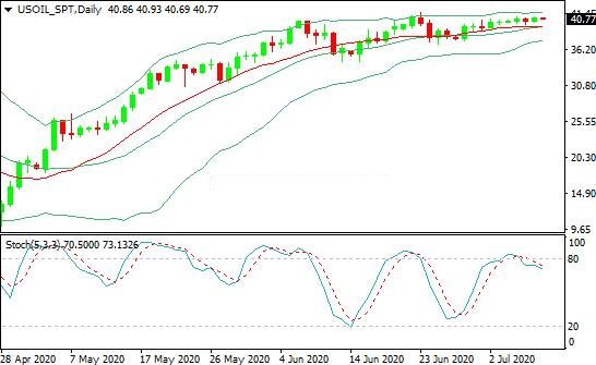 随着冠状病毒疫情继续在全球蔓延,以及国际紧张局势令本已疲软的经济增长面临更多风险,进而打压原油需求前景。此外,美国原油库存增加也一度施压油价。但由于美元疲软和美国汽油需求显现复苏迹象,支持油价周三小幅上涨。截止美国收盘,美国WTI原油8月期货收涨0.51美元,或1.26%,报40.87美元/桶,最高触及41.05美元/桶,最低