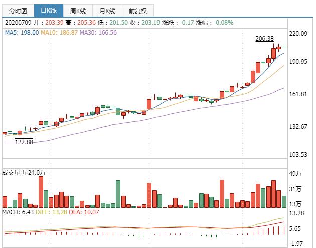 今开:203.39成交量:2398.9万振幅:1.90% 最高:205.36成交额:48.63亿换手:0.63% 最低:201.50总市值:7884.71亿市净率:9.62 昨收:203.36流通市值:7710.32亿市盈率(动):25.59 7月8日北向资金成交净买入11.53亿元。深沪股通成交活跃股中,五粮液全天成交22.28亿元,成交净卖出1