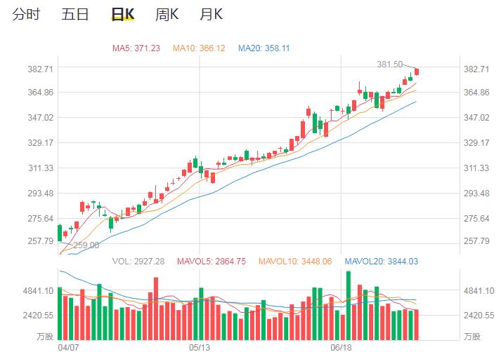 最高381.50最低376.36成交量2,927万成交额111亿 今开376.72昨收372.69日振幅1.38%换手率0.68% 总市值16,530亿流通市值16,513亿总股本43.34亿流通股本43.30亿 7月8日,苹果公司股价在美股市场周三早盘涨超2%创新高,原因是德意志银行分析师JrilOg发布研究报告,上调了苹果股票的目标价至4