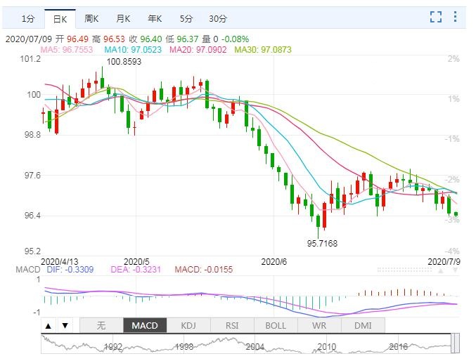 美元周三跌至两周低点,暂时显示避险吸引力减弱,因美国股指上扬,商品价格坚挺,尽管全球新冠病毒病例重燃,尤其是美国,但市场人气仍持谨慎态度。 美元指数收盘下跌0.49%,报96.49,盘中最低触及96.40,最高触及97.06。 美国银行周三发布研究报告称,美元指数未来数周面临进一步走弱的风险,因技术面