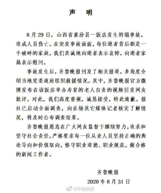 8月31日,齐鲁晚报就30日发布山西过寿老人自责下跪视频引发争议事件致歉,希望在广大网友监督下继续努力,追求和坚守社会责任,恪守职业道德、职业规范,做合格的新闻工作者。 以下为声明原文: 8月29日,山西省襄汾县一饭店发生坍塌事故,造成人员伤亡。在突发事故面前,每位逝者背后都是个破碎的家庭,我们真诚地向逝者