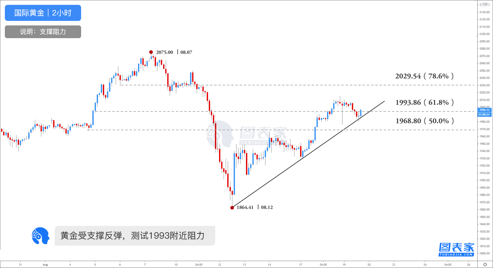黄金受支撑反弹,关注1993阻力; 金价在测试短期上升趋势线支撑后反弹走高,目前正测试斐波那契61.8%回调位1993.86附近阻力,突破后未来或将进一步看涨至斐波那契78.6%回调位2029.54. 若金价跌破趋势线支撑,后市或将进一步测试斐波那契50.0%回调位1968.80支撑。 观点:短线看涨,关注1993附近破位(