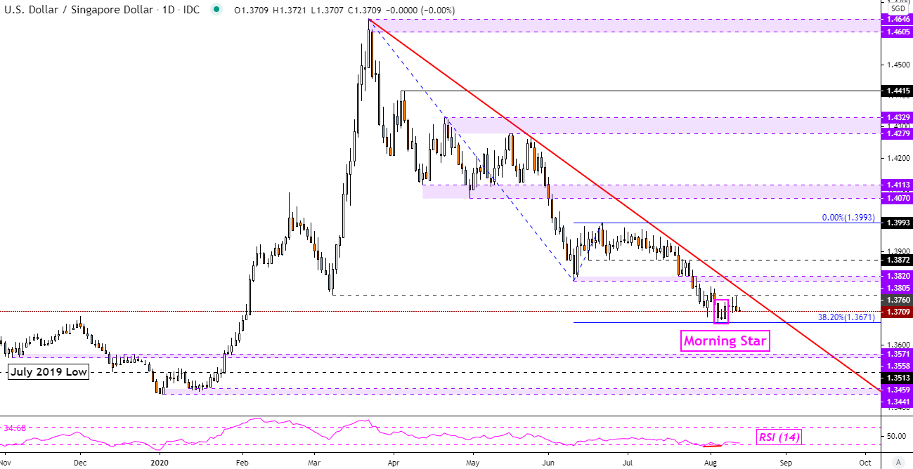 美元兑东盟货币在技术图表上出现了不同方向的信号,相信遵守技术规则的投资者将从中获益匪浅。 新加坡币技术展望 美元兑新加坡币或正为反转走高做好准备。美元/新加坡币日图上最近形成了一个早晨之星看涨形态。不过,由于汇价难以站上3月低点1.3760,上行趋势在某种程度上还缺乏确认。另外,始于2020年高点的关键阻