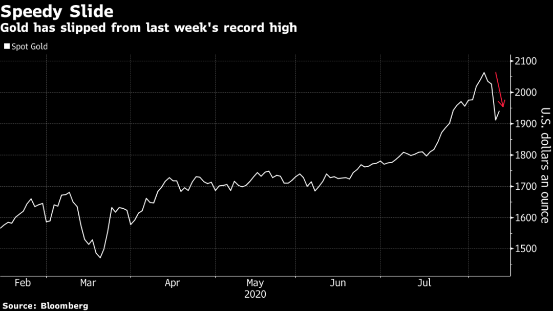 黄金从纪录高位急速下跌引发疑问:这是这个避险资产已经触顶的信号,还是再创新高前的回调? 受全球刺激措施、负实际利率和美元疲软推动,今年以来黄金大涨30%以上,刷新2011年创下的前纪录高位。包括高盛和美国银行在内的一些银行预测黄金将继续攀升。 但是在上周五(8月7日)创下每盎司超过2070美元的新高后,黄