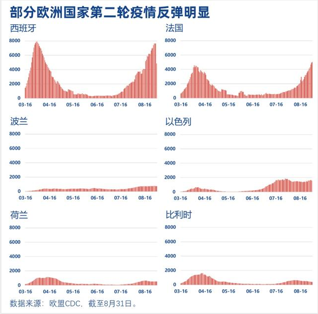 【欧洲开始反弹】 近期,欧洲多个国家的新冠疫情出现不同程度反弹。欧洲国家在上半年经历一个疫情高峰后,曾经在一段时间内成功控制疫情,如今为何疫情又卷土重来?欧洲疫情防控的难点何在? 【为何反弹】 欧洲疾病预防控制中心的数据显示,近来欧洲疫情明显反弹。在曾出现较严重疫情的国家中,西班牙近来多次单日新