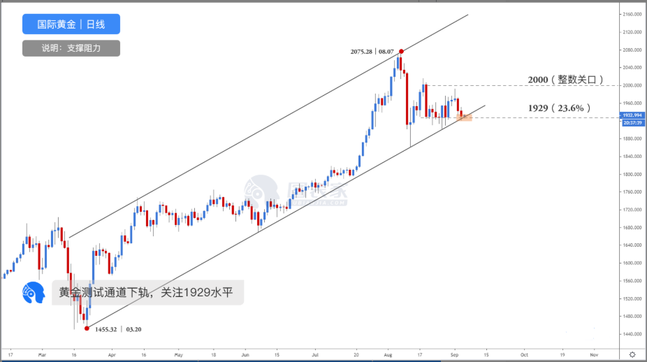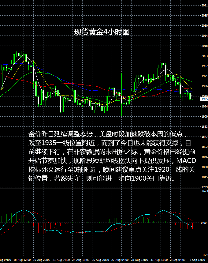 【黄金行情回顾】 周三欧美股市联袂上涨对避险情绪有所打压,经济数据的回暖令美元大幅反弹,黄金震荡走低,盘中最低触及1926.8附近。因美国8月AD数据远不及预期,一定程度上限制了金价跌势。 【黄金基本面分析】 数据方面,周三晚间公布的美国8月AD就业人数录得42.8万,尽管创下有记录以来的第三大增幅,但仍大幅