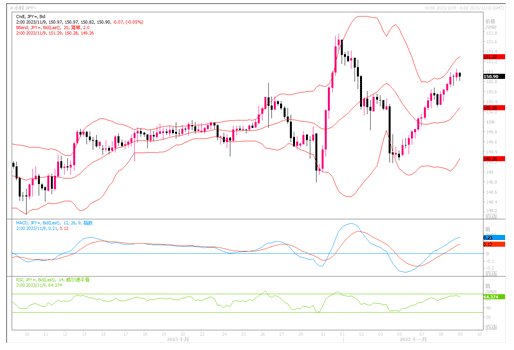 货币:美元/日元 周三(11月8日),美元兑日元继续上涨0.41%,至151.03,重新回到投资者警惕可能会出现干预的汇价水平。鲍威尔在周三的发言中没有对货币政策置评,他还将在周四发表讲话。美元/日元继续在调整修复上周所产生的跌幅。虽然本周至今,日元连续多个交易日缓缓回落,然而有消息透露,在外汇期权市场上,仓